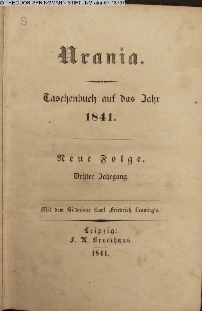 Urania. / Taschenbuch auf das Jahr / 1841. / Neue Folge. / Dritter Jahrgang. / Mit dem Bildnisse Karl Friedrich Lessing's. / Leipzig: / F. A. Brockhaus. / 1841