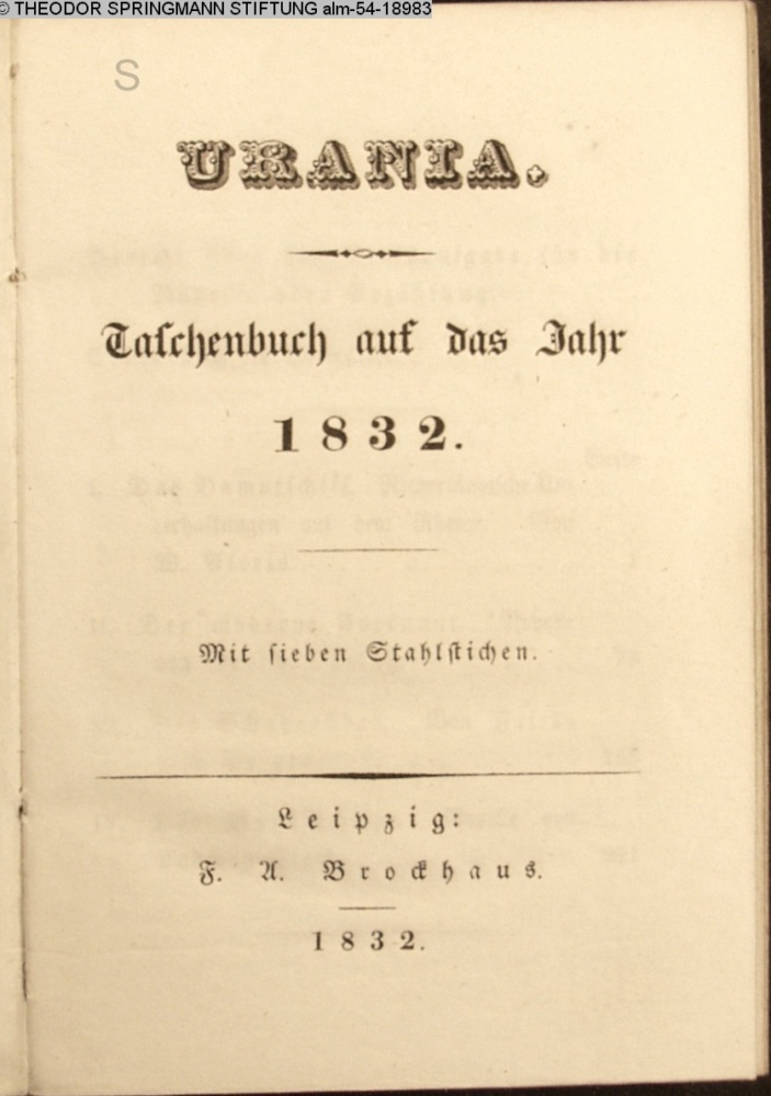 URANIA. / Taschenbuch auf das Jahr / 1832. / Mit sieben Stahlstichen. / Leipzig: / F. A. Brockhaus. / 1832