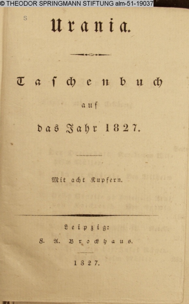 URANIA. / Taschenbuch auf das Jahr / 1827. / Mit acht Kupfern. / Leipzig: / F. A. Brockhaus. / 1827