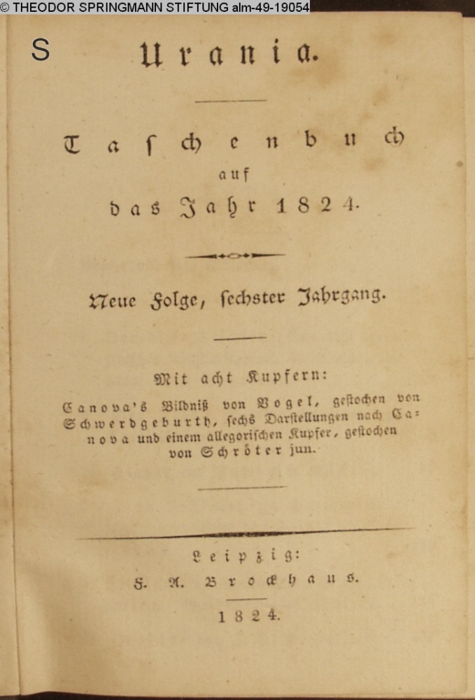 Urania. / Taschenbuch / auf das Jahr 1824. / Neue Folge, sechster Jahrgang. / Mit acht Kupfern: / Canova's Bildniß von Vogel, gestochen von / Schwerdgeburth, sechs Darstellungrn nach Ca- / nova und einem allegorischen Kupfer, gestochen / von Schröter jun. / Leipzig: / F. A. Brockhaus. / 1824