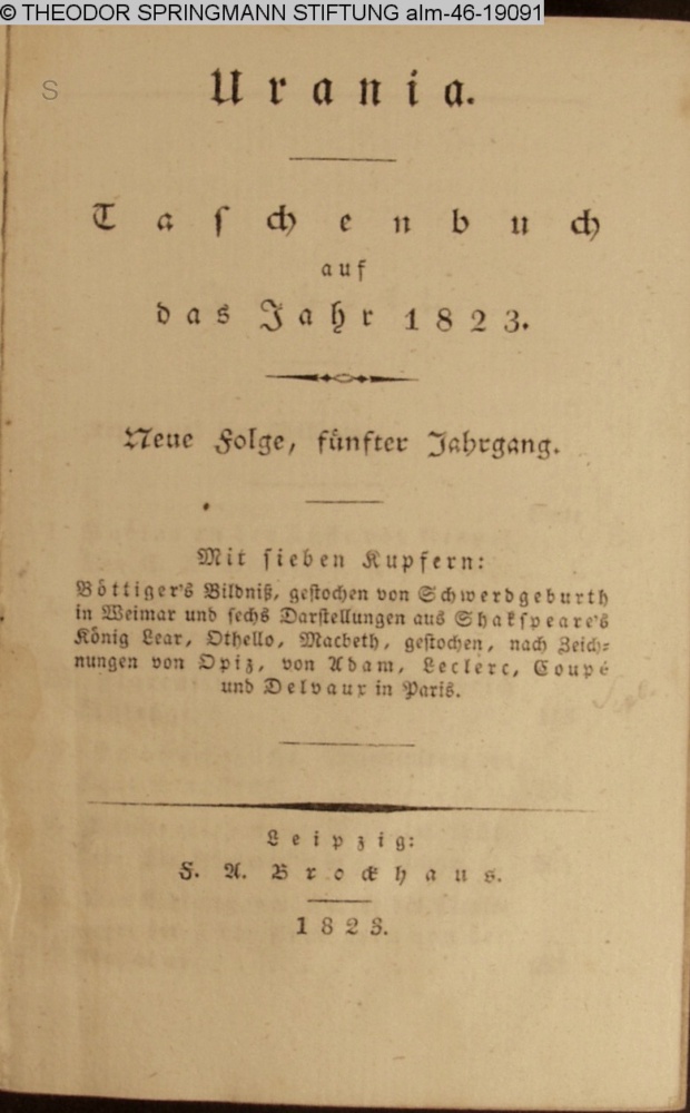 Urania. / Taschenbuch / auf / das Jahr 1823. / Neue Folge, fünfter Jahrgang. / Mit sieben Kupfern: / Böttiger's Bildniß, gestochen von Schwerdgeburth / in Weimar und sechs Darstellungen aus Shakespeare's / König Lear, Othello, Macbeth, gestochen, nach Zeich- / nungen von Opiz, von Adam, Leclerc, Coupé / und Delvaux in Paris. / Leipzig: / F. A. Brockhaus. / 1823