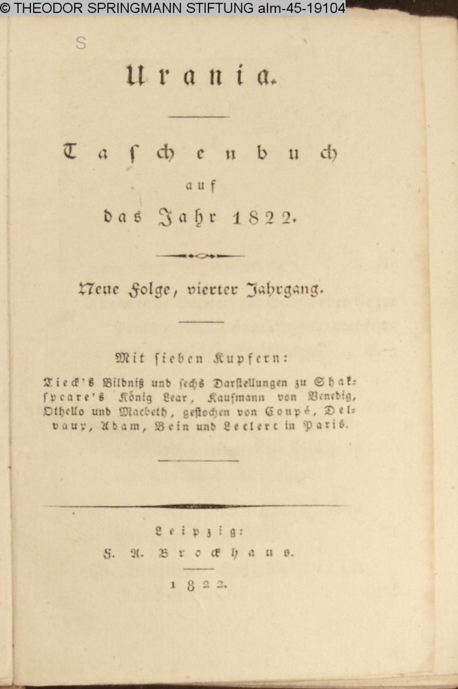 Urania. / Taschenbuch / auf / das Jahr 1822. / Neue Folge, vierter Jahrgang. / Mit sieben Kupfern: / Tieck's Bildniß und sechs Darstellungen zu Shak- / speare's König Lear, Kaufmann von Venedig, / Othello und Macbeth, gestochen von Coupé, Del- / vaux, Adam, Bein und Leclerc in Paris. / Leipzig: / F. A. Brockhaus / 1822