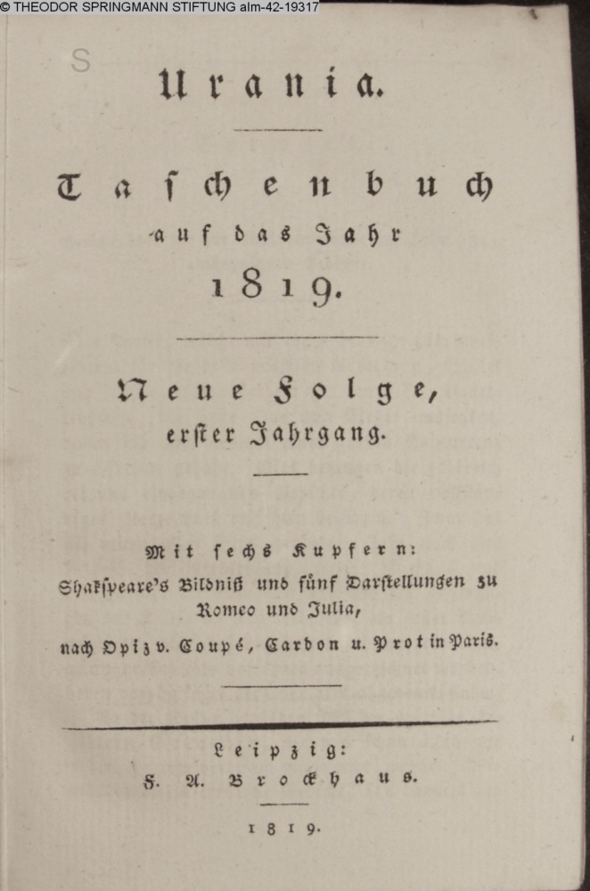 Urania. / Taschenbuch / auf das Jahr / 1819 / Neue Folge, / erster Jahrgang. / Mit sechs Kupfern: / Shakespare's Bildniß und fünf Darstellungen zu / Romeo und Julia / nach Opiz v. Coupé, Cardon u. Prot in Paris. / Leipzig: / F. A. Brockhaus. / 1819