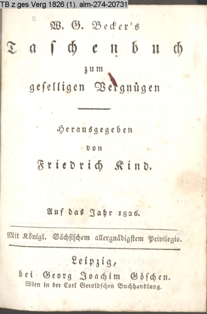 W. G. Becker's / Taschenbuch / zum / geselligen Vergnügen. / Herausgegeben / von / Friedrich Kind. / Auf das Jahr 1826. / Mit Königl. Sächsischem allergnädigstem Privilegio. / Leipzig, / bei Georg Joachim Göschen. / Wien in der Carl Geroldschen Buchhandlung
