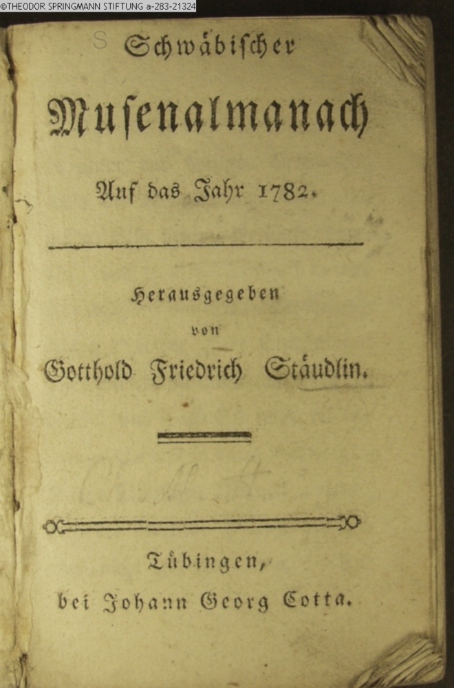 Schwäbischer / Musenalmanach / Auf das Jahr 1782. / Herausgegeben / von / Gotthold Friedrich Stäudlin. / Tübingen, / bei Johann Georg Cotta