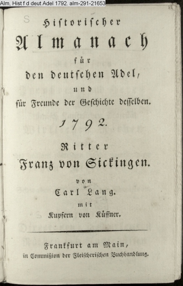 Historischer / Almanach / für / den deutschen Adel / und / für Freunde der Geschichte desselben / 1792. / Ritter / Franz von Sickingen. / von / Carl Lang. / mit / Kupfern von Küffner. / Frankfurt am Main, / in Commißion der Fleischerischen Buchhandlung