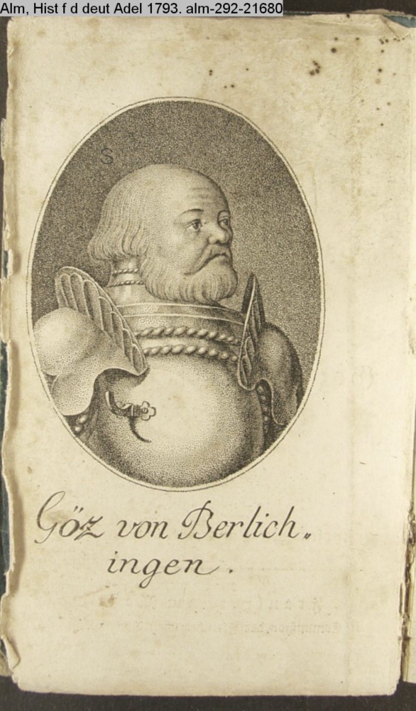 Historischer / Almanach / für / den deutschen Adel / und / für Freunde der Geschichte desselben / 1793. / Ritter / Göz von Berlichingen, / mit der eisernen Hand. / von / Carl Lang. / mit Kupfern von Küffner, d'Argens, u. a. / Frankfurt am Main, / in Commißion der Fleischerischen Buchhandlung