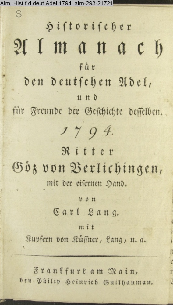 Historischer / Almanach / für / den deutschen Adel / und / für Freunde der Geschichte desselben / 1794. / Ritter / Göz von Berlichingen, / mit der eisernen Hand. / von / Carl Lang. / mit Kupfern von Küffner, Lang u. a. / Frankfurt am Main, / bey Philip Heinrich Guilhauman