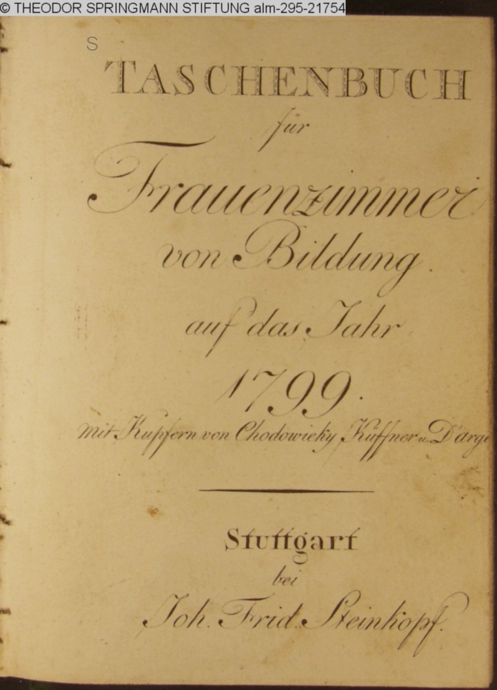 TASCHENBUCH / für / Frauenzimmer / von Bildung. / auf das Jahr 1799. / herausgegeben / Von C. L. Neuffer. / Mit Kupfern aus Göthe's Herrmann und Dorothea. / Stuttgart, bey J. F. Steinkopf