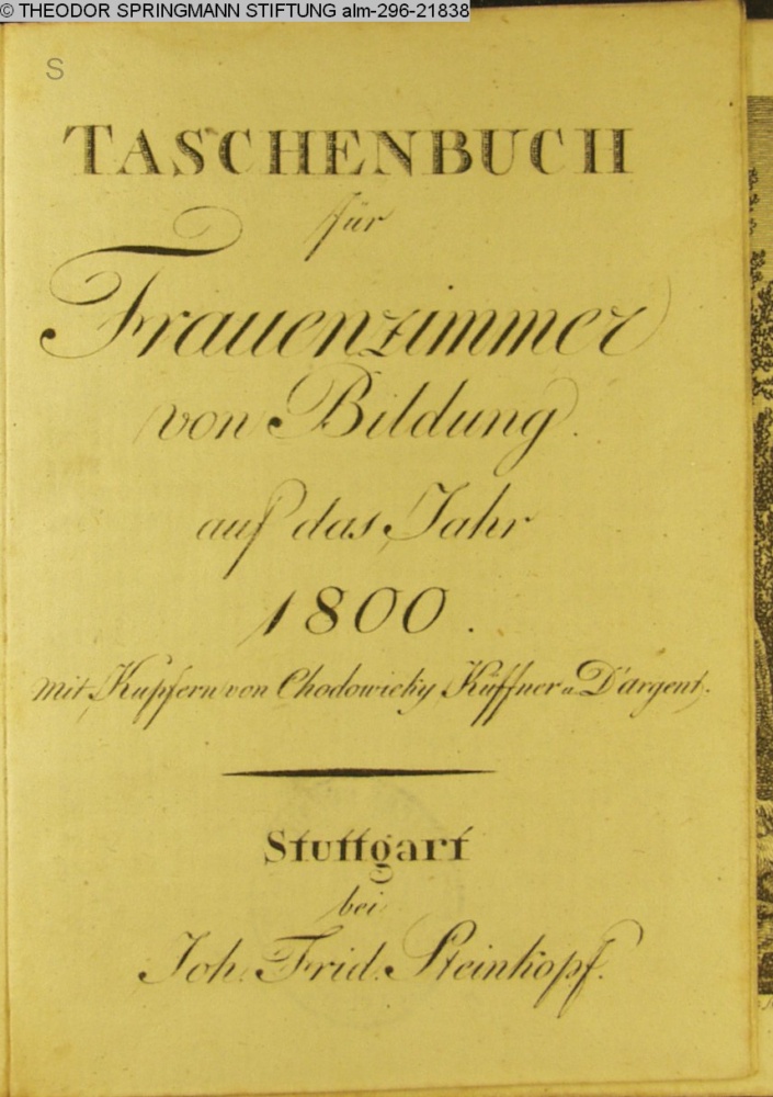 TASCHENBUCH / für / Frauenzimmer / von Bildung. / auf das Jahr / 1800. / Mit Kupfern von Chodowiecky, Küffner, D'Argent / Stuttgart / bei / Joh. Frid. Steinkopf