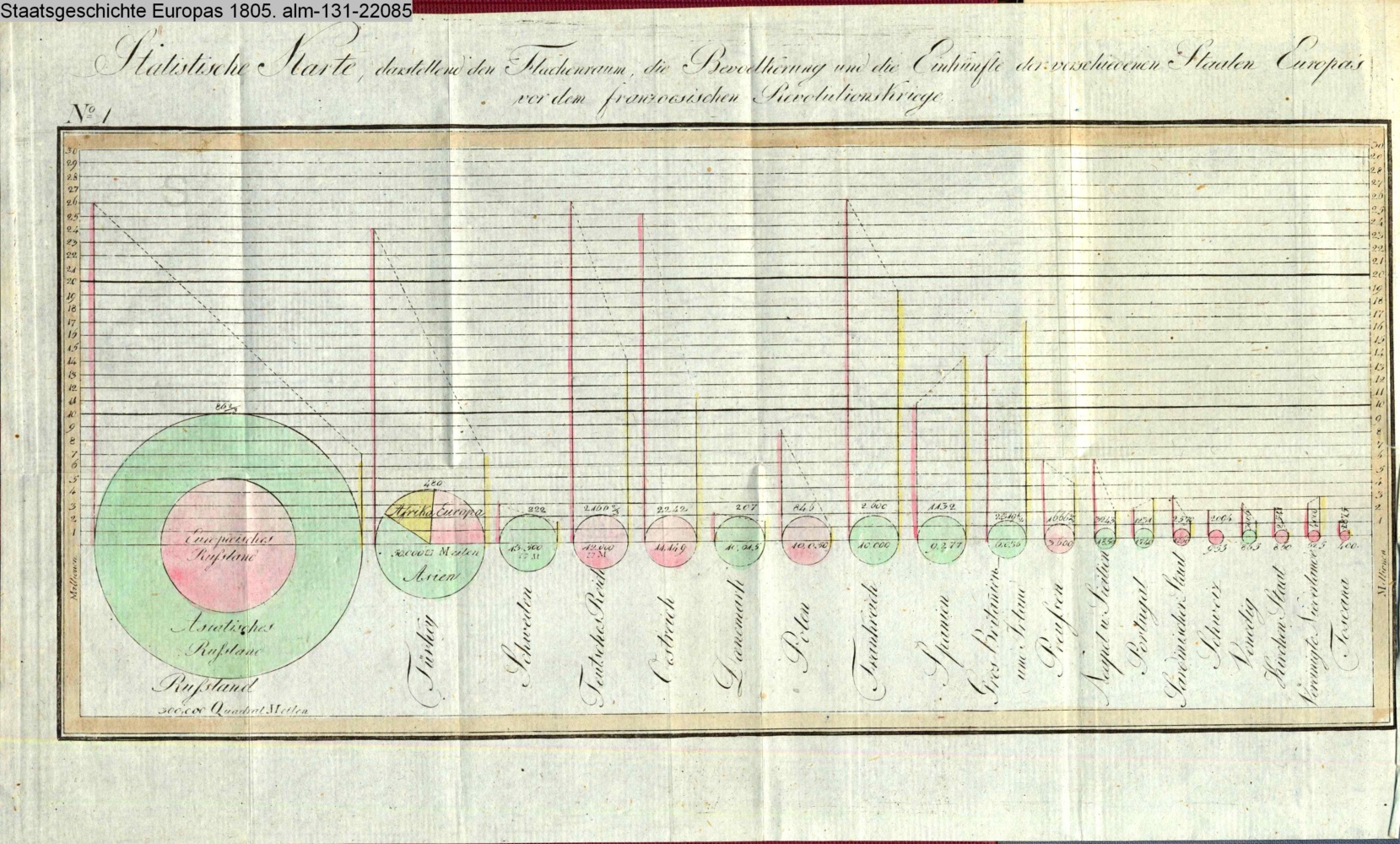 Statistische Karte, darstellend den Flächenraum, die Bevölkerung und die Einkünfte der verschiedenen Staaten Europas / vor dem französischen Revolutionskriege