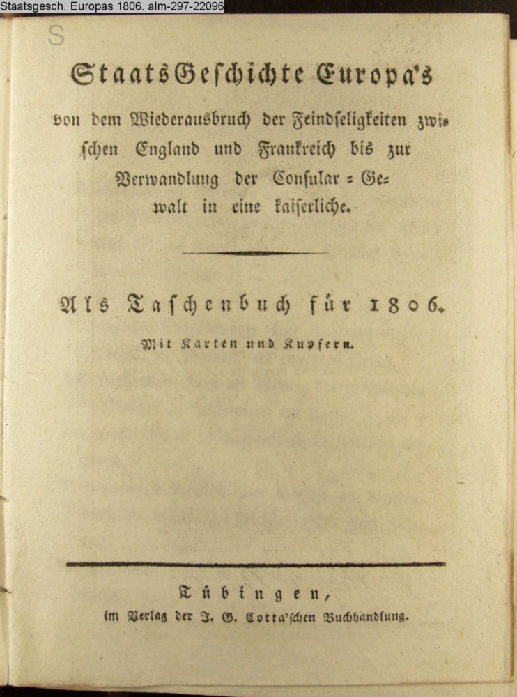 StaatsGeschichte Europa's / von dem Wiederausbruch der Feindseligkeiten zwi- / schen England und Frankreich bis zur / Verwandlung der Consular-Ge- / walt in eine kaiserliche. / Als Taschenbuch für 1806. / Mit Karten und Kupfern. / Tübingen, / im Verlag der J. G. Cotta'schen Buchhandlung