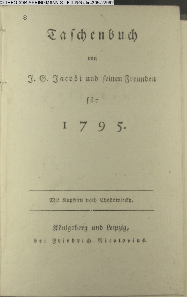 Taschenbuch / von / J. G. Jacobi und seinen Freunden / für / 1795. / Mit Kupfern nach Chodowiecky. / Königsberg und Leipzig, / bei Friedrich Nicolovius