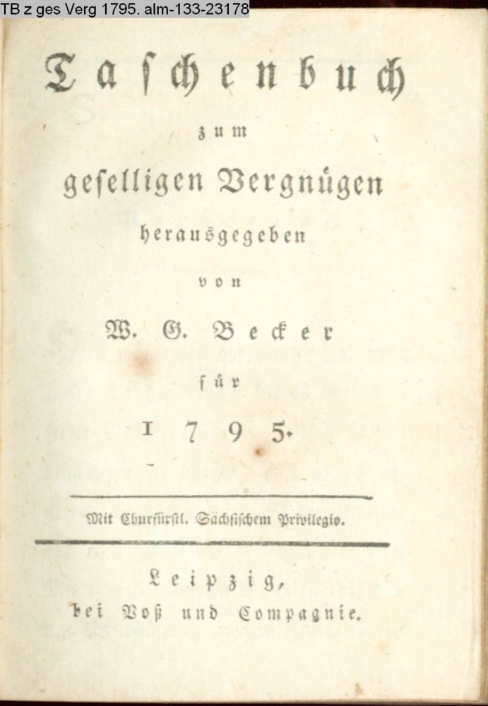 Taschenbuch / zum / geselligen Vergnügen / herausgegeben von / W. G. Becker. / für / 1795. / Mit Churfürstl. Sächsischem Privilegio. / Leipzig, / bei Voß und Compagnie