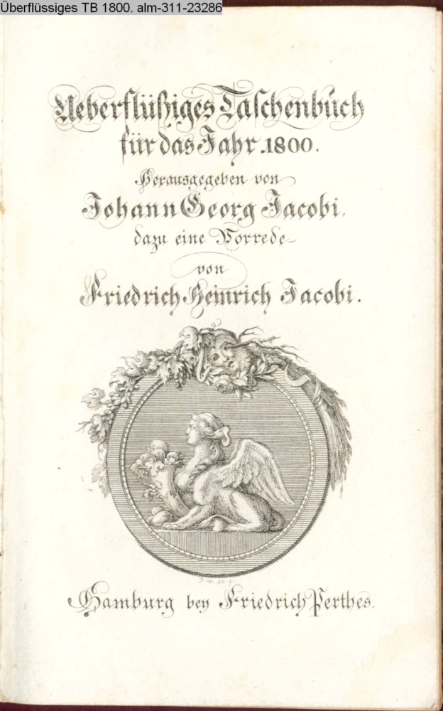 Ueberflüßiges Taschenbuch / für das Jahr 1800. / Herausgegeben von / Johann Georg Jacobi, / dazu eine Vorrede / von / Friedrich Heinrich Jacobi. / Hamburg bey Friedrich Perthes