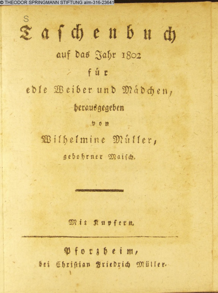 Taschenbuch / auf das Jahr 1802 / für / edle Weiber und Mädchen, / herausgegeben / von / Wilhelmine Müller, / gebohrner Maisch. / Mit Kupfern. / Pforzheim, / bei Christian Friedrich Müller