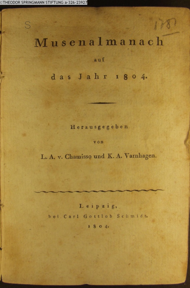 Musenalmanach / auf / das Jahr 1804. / Herausgegeben / von / L. A. v. Chamisso und K. A. Varnhagen. / Leipzig, / bei Carl Gotthold Schmidt. / 1804
