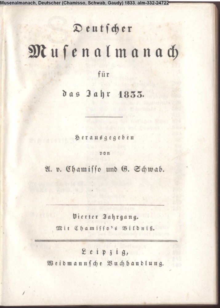 Deutscher / Musenalmanach / für / das Jahr 1833. / Herausgegeben / Von / A. v. Chamisso und G. Schwab. / Vierter Jahrgang. / Mit Chamisso's Bildniß. / Leipzig, Weidmannsche Buchhandlung