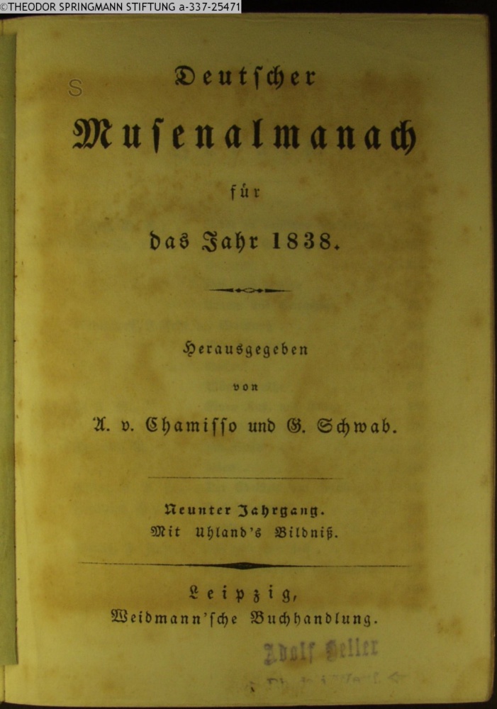 Deutscher / Musenalmanach / für / das Jahr 1838. / Herausgegeben / von A. v. Chamisso und G. Schwab. / Neunter Jahrgang. / Mit Uhland's Bildniß. / Leipzig, / Weidmann'sche Buchhandlung