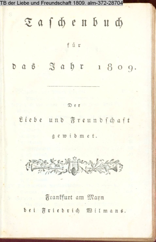 Taschenbuch / für / das Jahr 1809. / Der / Liebe und Freundschaft / gewidmet. / Frankfurt am Mayn / bei Friedrich Wilmans