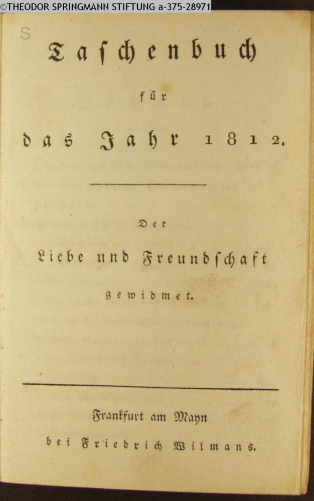 Taschenbuch / für / das Jahr 1812. / Der / Liebe und Freundschaft / gewidmet. / Frankfurt am Mayn / bei Friedrich Wilmans