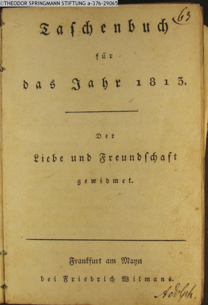 Taschenbuch / für / das Jahr 1813. / Der / Liebe und Freundschaft / gewidmet. / Frankfurt am Mayn, / bei Friedrich Wilmans