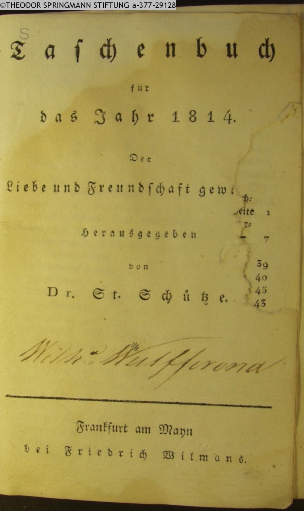 Taschenbuch / für / das Jahr 1814. / Der / Liebe und Freundschaft / gewidmet. / Herausgegeben / von / Dr. St. Schütze. / Frankfurt am Mayn / bei Friedrich Wilmans