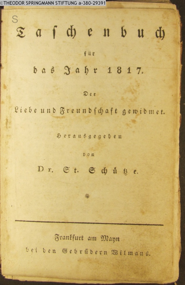 Taschenbuch / für / das Jahr 1817. / Der / Liebe und Freundschaft gewidmet. / Herausgegeben / von / Dr. St. Schütze. / Frankfurt am Mayn / bei den Gebrüdern Wilmans