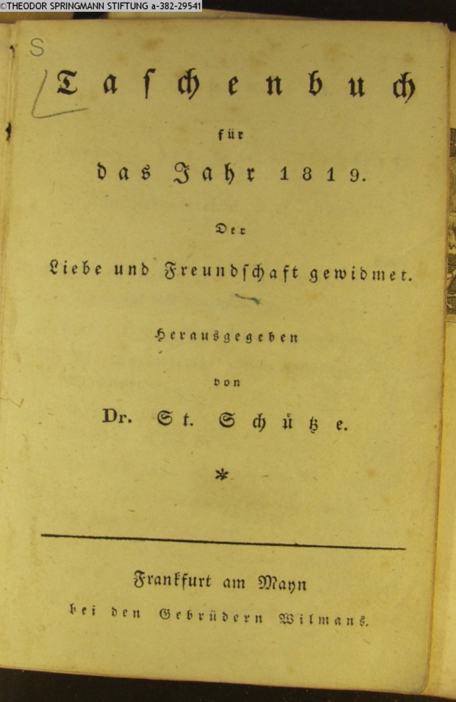 Taschenbuch / für / das Jahr 1819. / Der / Liebe und Freundschaft gewidmet. / Herausgegeben / von / Dr. St. Schütze. / Frankfurt am Mayn / bei den Gebrüdern Wilmans