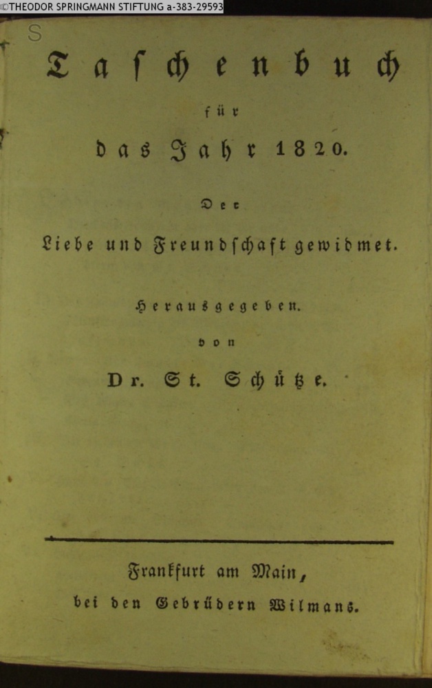 Taschenbuch / für / das Jahr 1820. / Der / Liebe und Freundschaft gewidmet. / Herausgegeben / von / Dr. St. Schütze. / Frankfurt am Mayn, / bei den Gebrüdern Wilmans