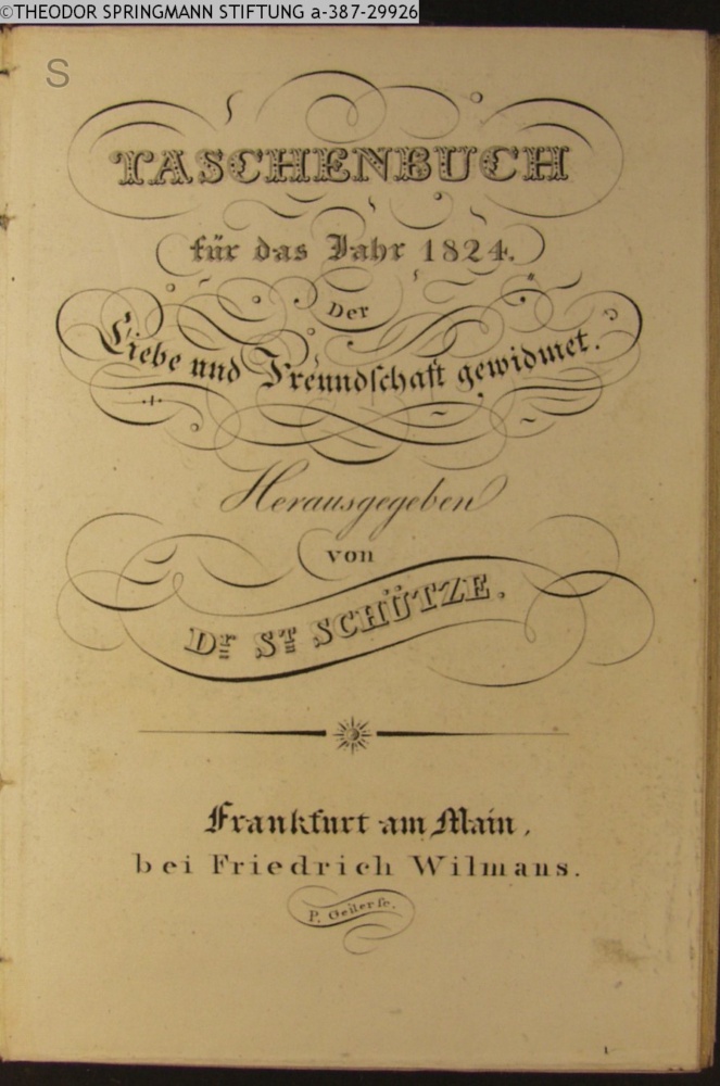 TASCHENBUCH / für das Jahr 1824. / Der / Liebe und Freundschaft gewidmet. / Herausgegeben / von / Dr. ST. SCHÜTZE. / Frankfurt am Main, / bei Friedrich Wilmans