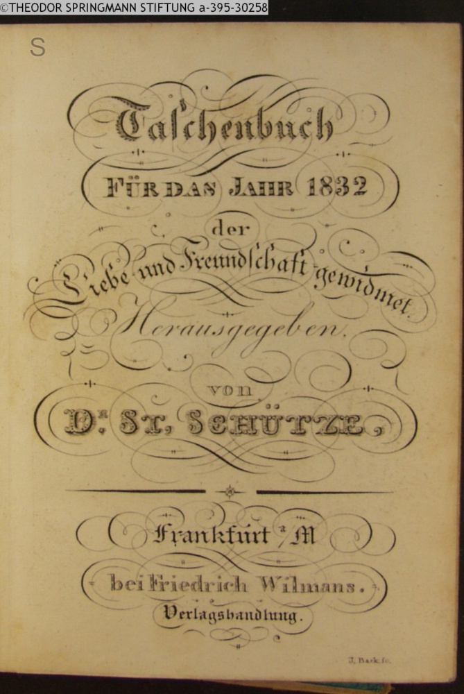 Taschenbuch / FÜR DAS JAHR 1832 / der / Liebe und Freundschaft gewidmet. / Herausgegeben / von / Dr. ST. SCHÜTZE. / Frankfurt a/M / bei Friedrich Wilmans. / Verlagshandlung