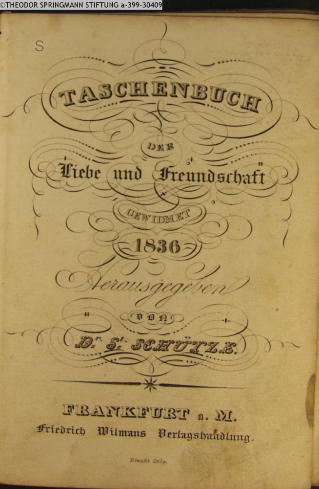TASCHENBUCH. / DER / Liebe und Freundschaft / GEWIDMET / 1836 / Herausgegeben / von / Dr. St. SCHÜTZE. / FRANKFURT a. M. / Friedrich Wilmans Verlagshandlung