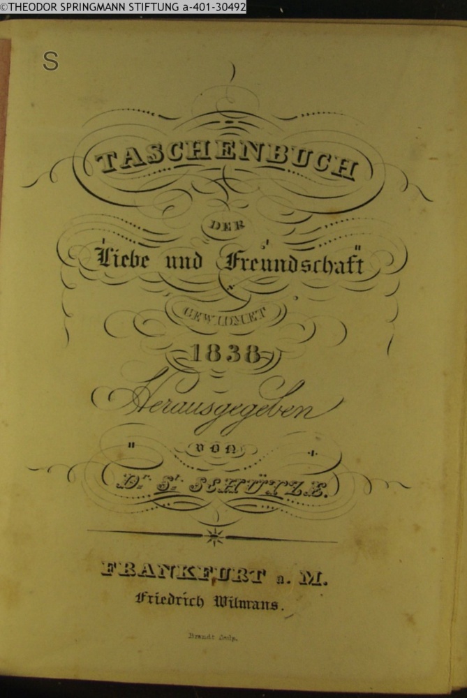 TASCHENBUCH / DER / Liebe und Freundschaft / GEWIDMET / 1838 / Herausgegeben / von / Dr. St. SCHÜTZE. / FRANKFURT a. M. / Friedrich Wilmans