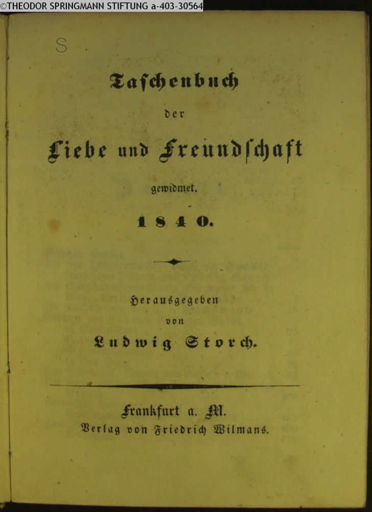 Taschenbuch / der / Liebe und Freundschaft / gewidmet. / 1840. / Herausgegeben / von / Ludwig Storch. / Frankfurt a. M. / Verlag von Friedrich Wilmans