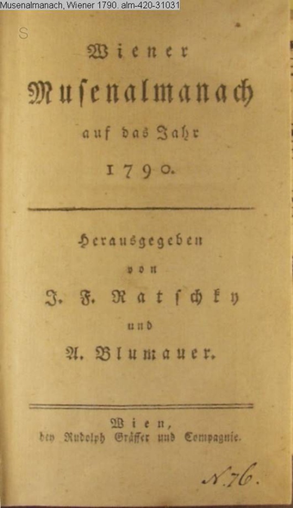 Wiener / Musenalmanach / auf das Jahr / 1790. / Herausgegeben / von / J. F. Ratschky / und / A. Blumauer. / Wien, / bey Rudolph Gräffer und Compagnie