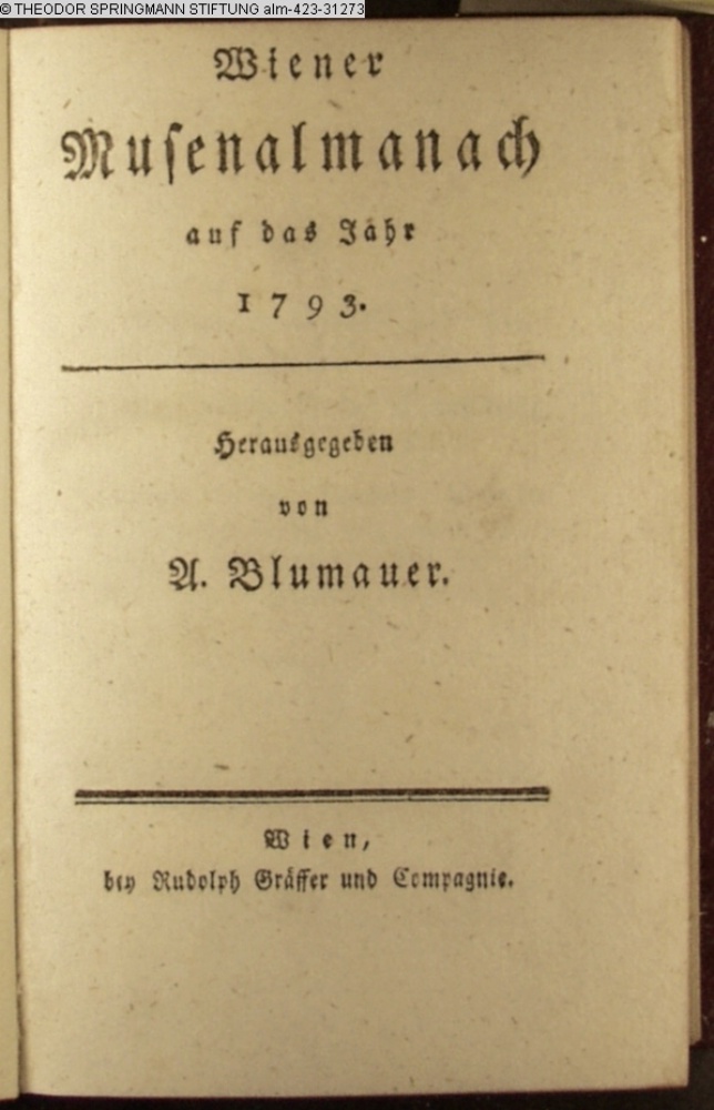 Wiener / Musenalmanach / auf das Jahr / 1793. / Herausgegeben / von / A. Blumauer. / Wien, / bey Rudolph Gräffer und Compagnie
