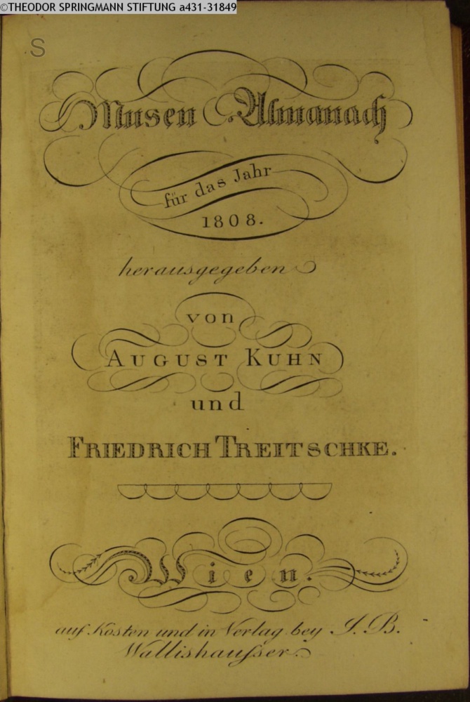 Musen-Almanach / für das Jahr / 1808. / herausgegeben / von / AUGUST KUHN / und / FRIEDRICH TREITSCHKE. / Wien. / auf Kosten und in Verlag bey J. B. / Wallishausser