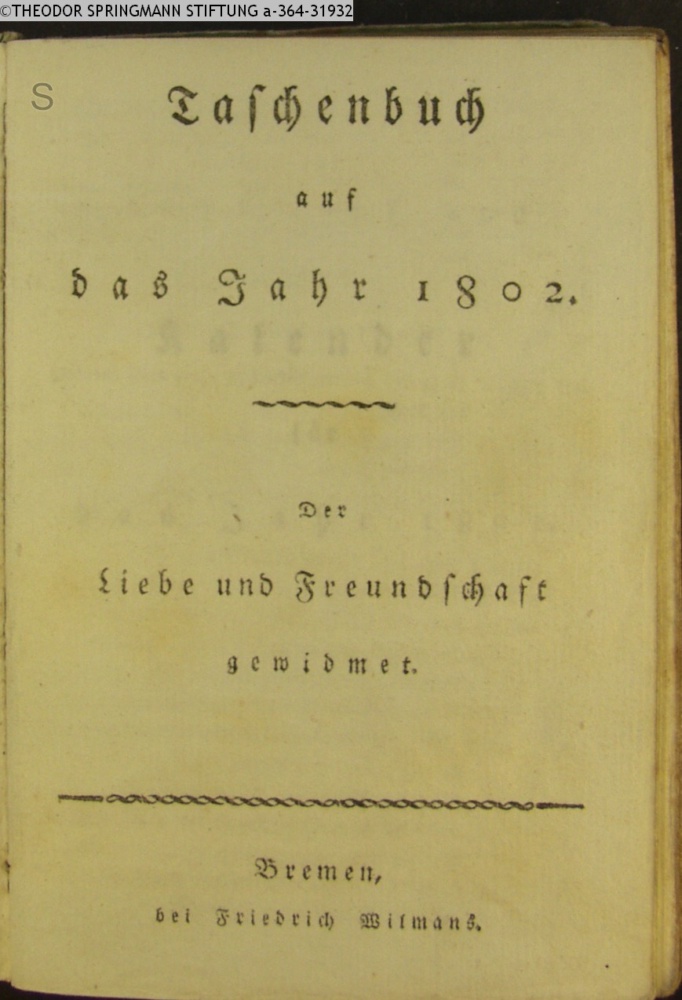 Taschenbuch / auf / das Jahr 1802. / Der / Liebe und Freundschaft / gewidmet. / Bremen, / bei Friedrich Wilmans