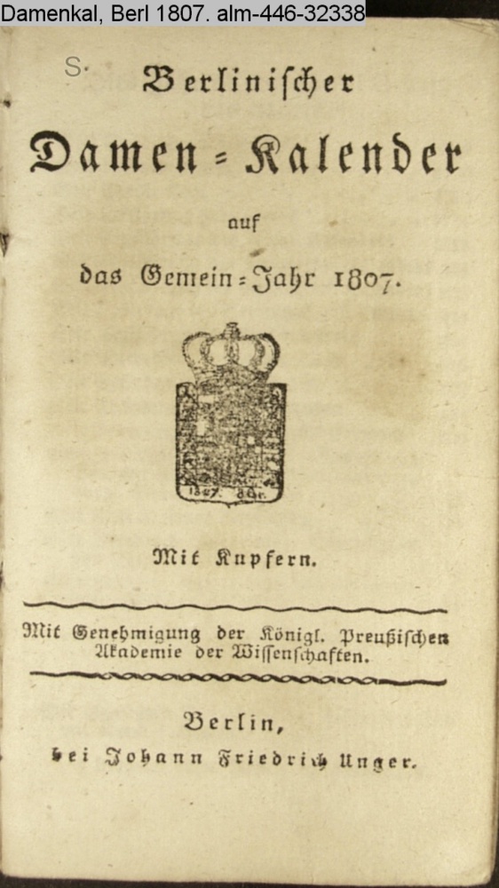 Berlinischer / Damen-Kalender / auf / das Gemein-Jahr 1807. / Mit Kupfern. / Mit Genehmigung der Königl. Preußischen / Akademie der Wissenschaften. / Berlin, / bei Johann Friedrich Unger