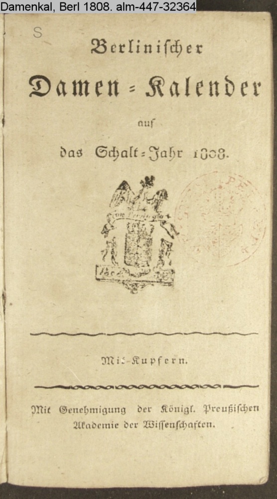 Berlinischer / Damen-Kalender / auf / das Schalt-Jahr 1808. / Mit Kupfern. / Mit Genehmigung der Königl. Preußischen / Akademie der Wissenschaften.