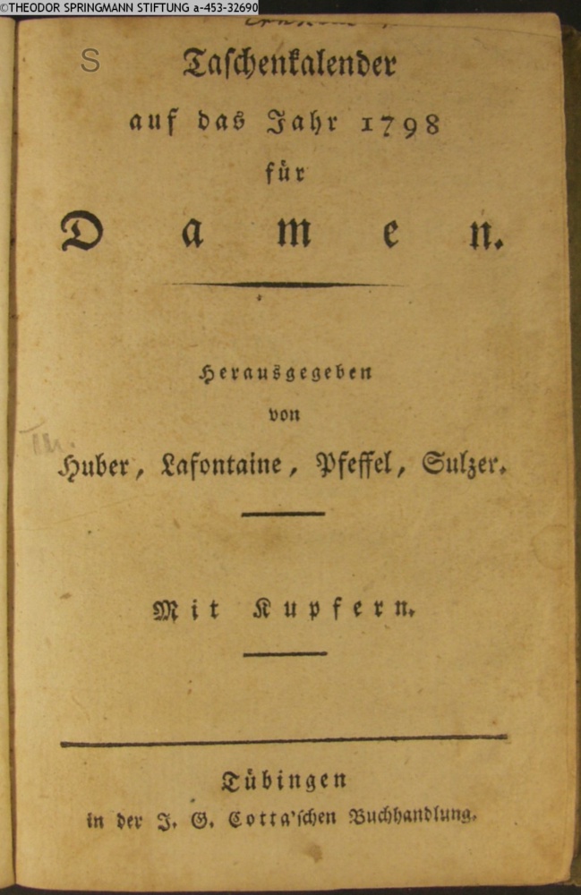 Taschenkalender / auf das Jahr 1798 / für / Damen. / Herausgegeben / von / Huber, Lafontaine, Pfeffel Sulzer. / Mit Kupfern. / Tübingen / in der J. G. Cotta'schen Buchhandlung
