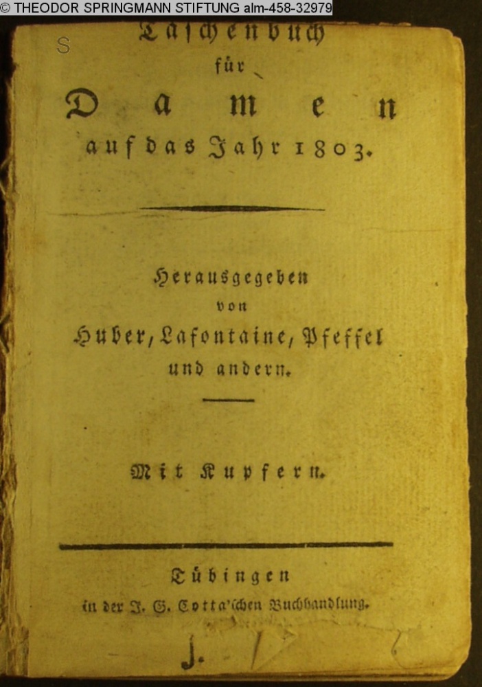 Taschenbuch / für / Damen / auf das Jahr 1803. / Herausgegeben / von / Huber, Lafontaine, Pfeffel / und andern. / Mit Kupfern. / Tübingen / in der J. G. Cotta'schen Buchhandlung