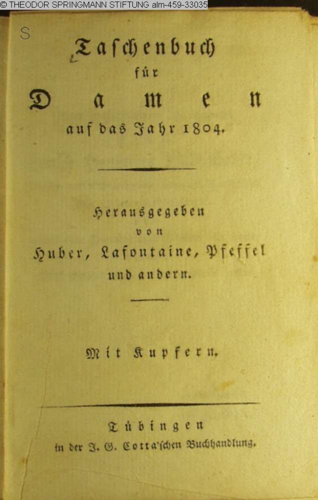 Taschenbuch / für / Damen / auf das Jahr 1804. / Herausgegeben / von / Huber, Lafontaine, Pfeffel / und andern. / Mit Kupfern. / Tübingen / in der J. G. Cotta'schen Buchhandlung