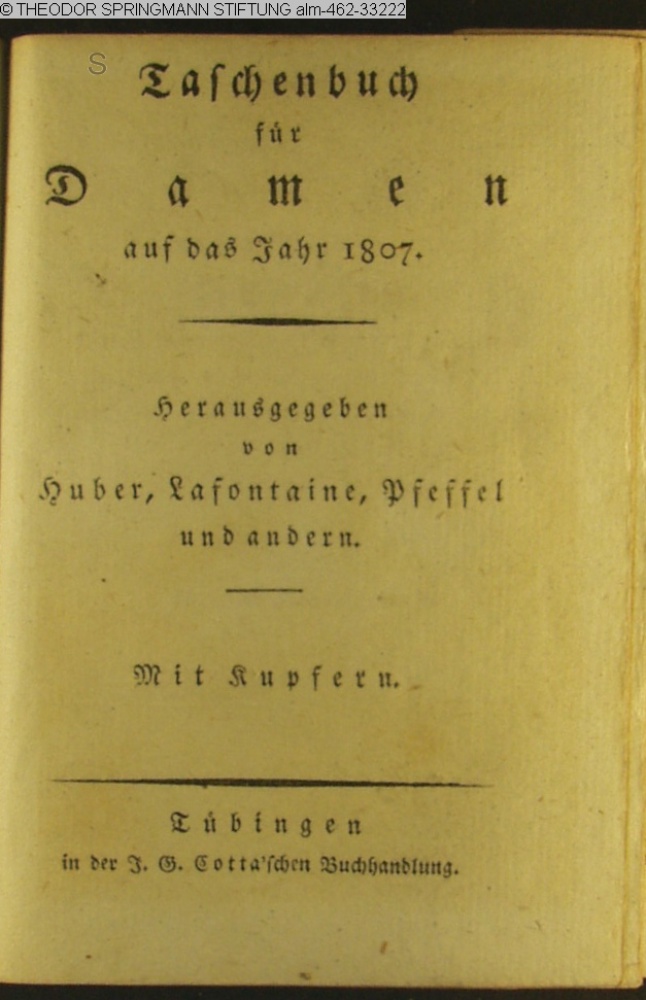 Taschenbuch / für / Damen / auf das Jahr 1807. / Herausgegeben / von / Huber, Lafontaine, Pfeffel / und andern. / Mit Kupfern. / Tübingen / in der J. G. Cotta'schen Buchhandlung