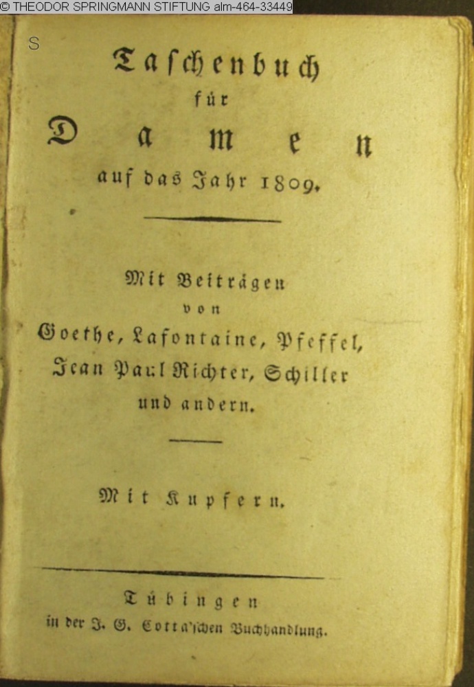 Taschenbuch / für / Damen / auf das Jahr 1809. / Mit Beiträgen / von / Goethe, Lafontaine, Pfeffel, / Jean Paul Richter, Schiller / und andern. / Mit Kupfern. / Tübingen / in der J. G. Cotta'schen Buchhandlung
