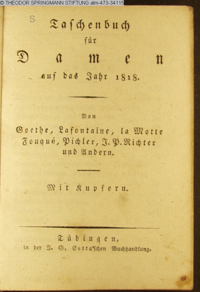 Taschenbuch / für / Damen / auf das Jahr 1818. / Von / Goethe, Lafontaine, la Motte / Fouqué, Pichler, J. P. Richter / und Andern. / Mit Kupfern. / Tübingen, / in der J. G. Cotta'schen Buchhandlung