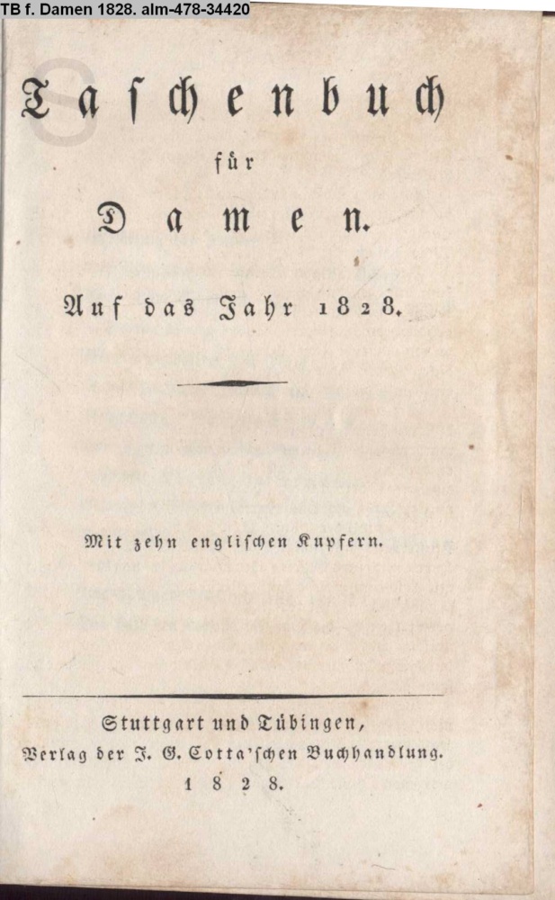 Taschenbuch / für / Damen. / Auf das Jahr 1828. / Mit zehn englischen Kupfern. / Stuttgart und Tübingen, / Verlag der J. G. Cotta'schen Buchhandlung. / 1828