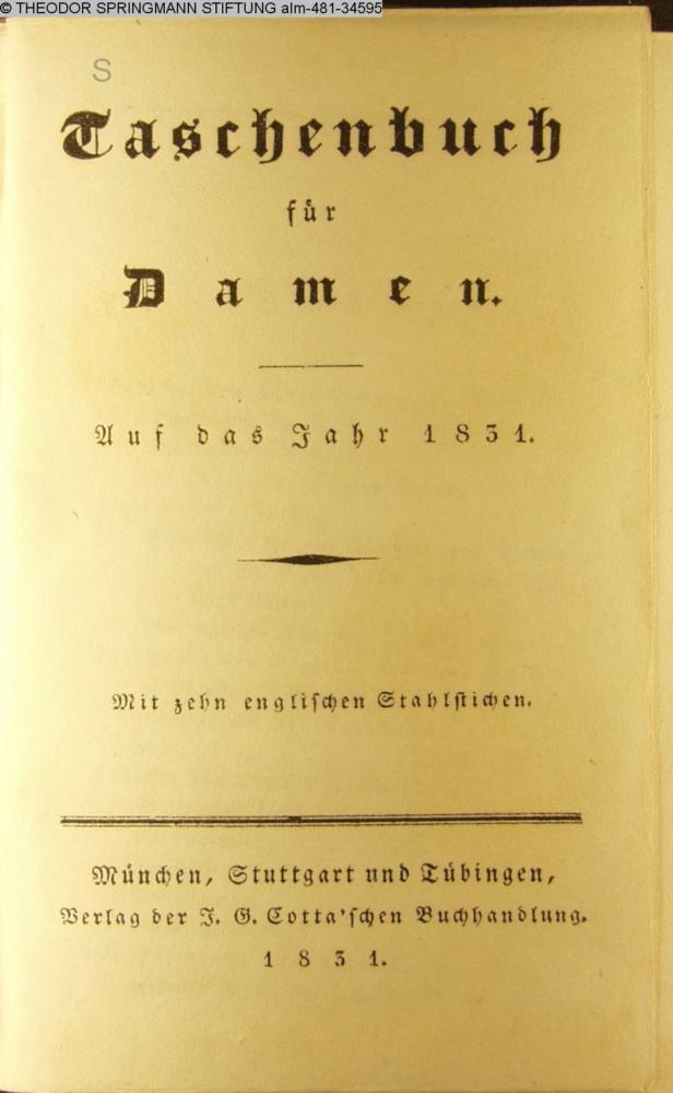 Taschenbuch / für / Damen. / Auf das Jahr 1831. / Mit zehn englischen Stahlstichen. / München, Stuttgart und Tübingen, / Verlag der J. G. Cotta'schen Buchhandlung. / 1831