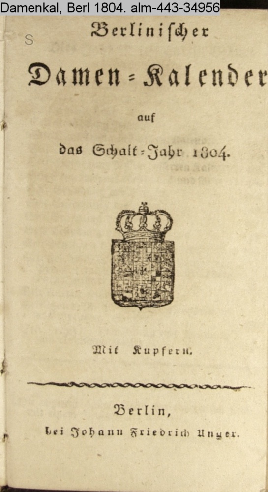 Berlinischer / Damen-Kalender / auf / das Schalt-Jahr 1804. / mit Kupfern. / Berlin / bei Johann Friedrich Unger